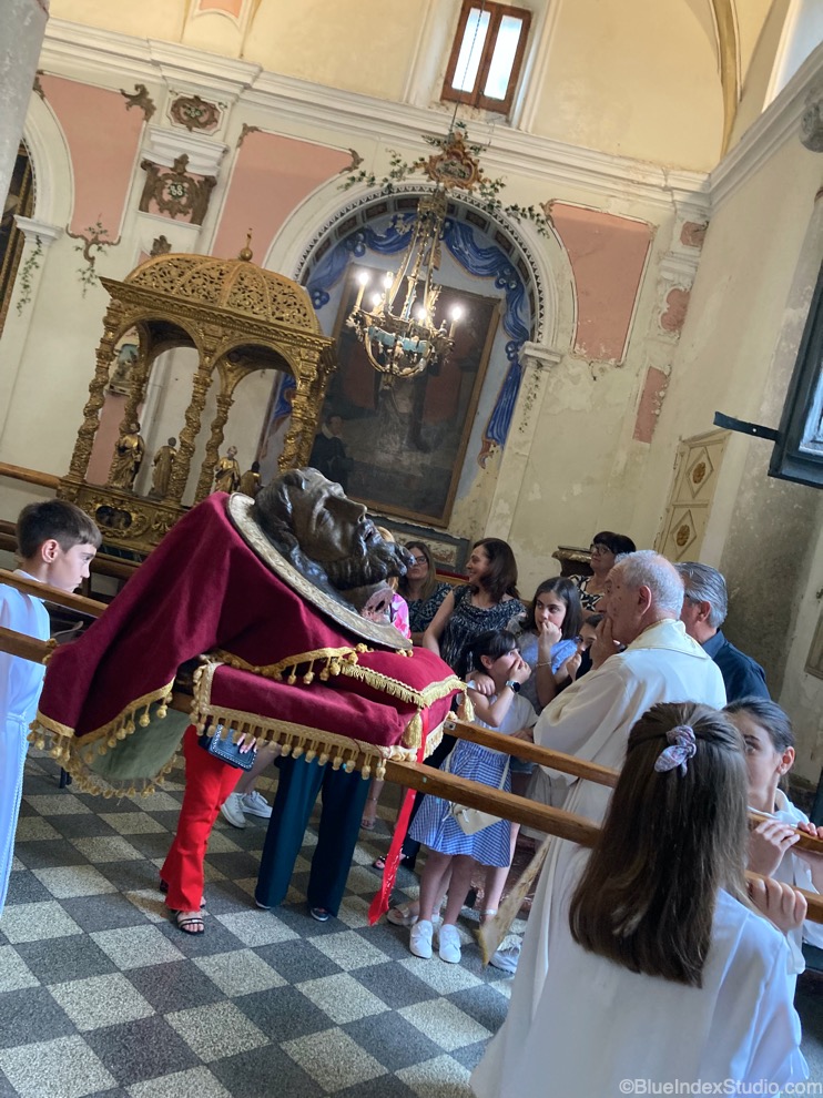 向かって左に聖母子。天井から二人の背後まで背面はオリーブ色、表面は金糸と赤で織られ縁取りで整えられたタペストリー。その前でゆったりと腰を下ろす聖母マリアの衣装は彼女の色とされるブルーを中心に金色がアクセントがいろいろな方法で取り入れられている。マントの控えめな縁取りもそうだが、袖に施された立体感のある刺繍も布の質感の豪華さも非常に詳細だ。そしてこの母と子の日常の営みにはそこはかとない穏やかな優美さが表現されている。こうした聖母子をペンと紙を手にしながら見つめる聖ルカ。真剣な表情には緊張が隠せない。ただ聖母子を見る眼差しは、感動と喜びでほとんど恍惚として見える。