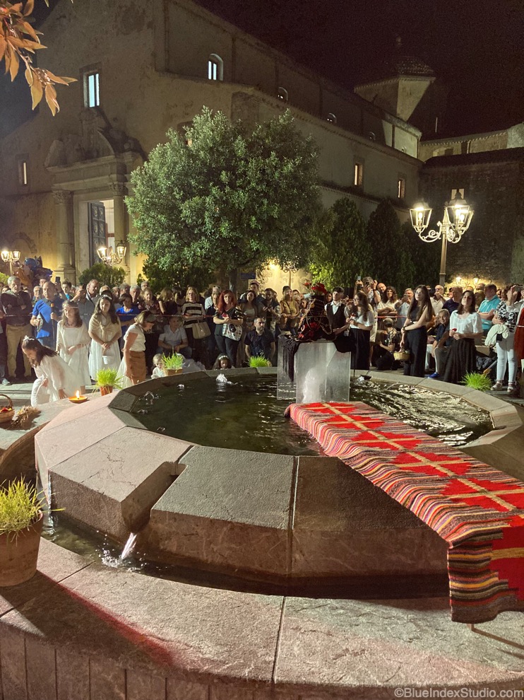 微細にわたって美しく描かれた室内は二本の柱を境に神聖な場面が区切られて、市井の世界へと外に開かれていく。中心の水辺は左右に緩やかな入江を作りながら中心を維持し、鑑賞者の視線を遥か遠くまで導いている。そして外には人々の日常の暮らしが見える。