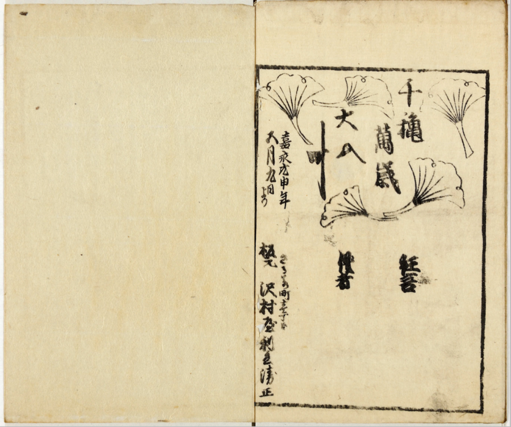 こちらは表紙。役者の名前が定紋と一緒に記載されています。中央の堂々とした太字は座元「中村勘三郎」。この役割番付は表紙を入れて6頁の冊子。中には『神霊矢口渡』『仇縁浮名*』のほかに『月梅摂景清(つきのうめめぐみのかげきよ)』、『手向杜若四季咲(たむけぐさゆかりのしきざき)』も上演予定とされていた。