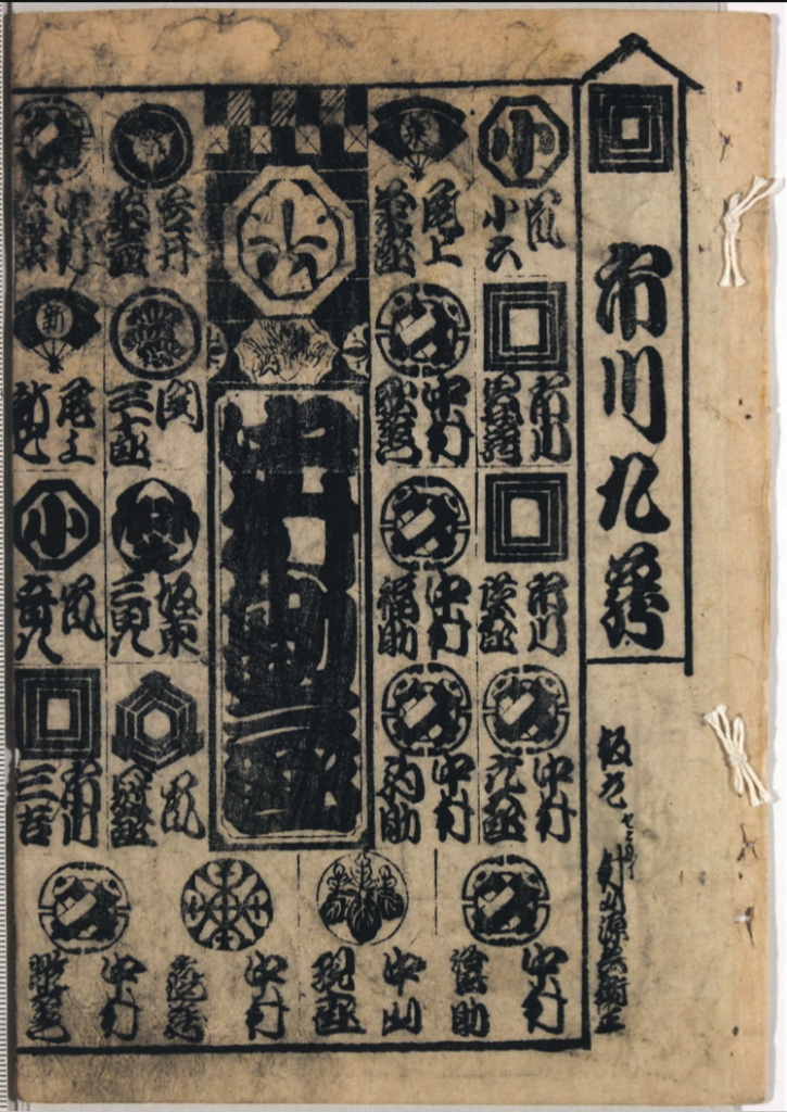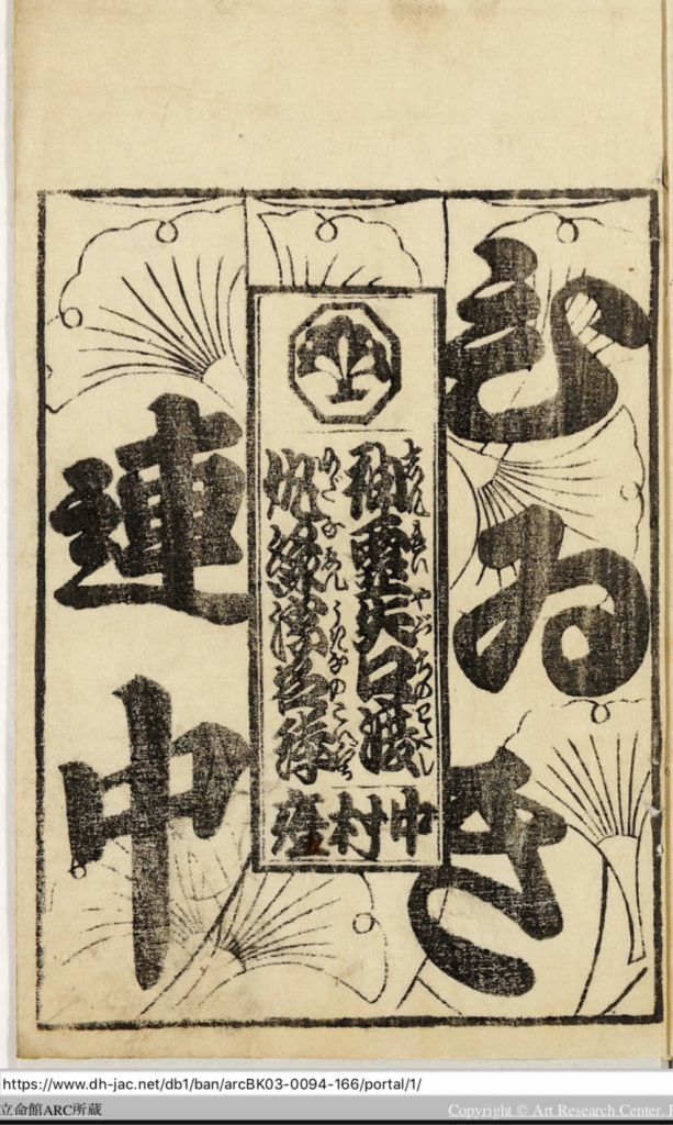 目に着くのは大きく両側に書かれた「飛ゐき連中」。連中(れんじゅう)とは歌舞伎用語で俳優を後援する観劇団体のこと。今で言うならファンクラブと言ったところだろう。この表紙のレイアウトは定番となっているようだ。中央には中村勘三郎の紋、そして外題『神霊矢口渡』『仇縁浮名琫』「中村座」と書かれている。