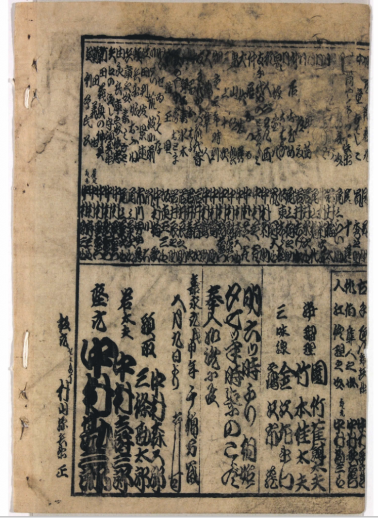 役割番付の最後のページ。左下の枠の始めに「嘉永元戌申年五月九日より」とあり、年表示もある。辻番付の告知より開演が6日ほど遅れたようだ。