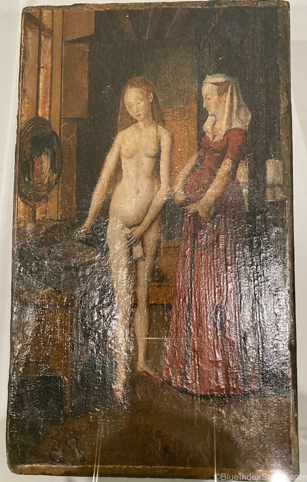 作品に添えられたキャプションをたどってみよう。 タイトルは《Woman at Her Toilet》。トイレットは用を足す場所のイメージが強いが、バスルーム、洗面所、化粧室を兼ね備えた身支度をする場所、または少し古い言い方では身支度そのものも意味する。今回の作品の場面の女性は裸なので水浴の場面だろう。 画家名は未確認。生没年の欄に「フランドル派 c. 1390-1441」と、ヤン・ファン・エイクの生没年代(といわれる)が記載され、制作年は16世紀初頭とある。そして、ヤン・ファン・エイクの時代に水浴の場面がよく描かれとのこと。作品はその時代の作品を元に、16世紀初頭にコピーされたものだそう。寓意や道徳的な意味あいで制作され、識者の見解としてバテシバやイヴ、ヴィーナスのほか、ルクスリアやヴァニタスなどが描かれた可能性が指摘されている。